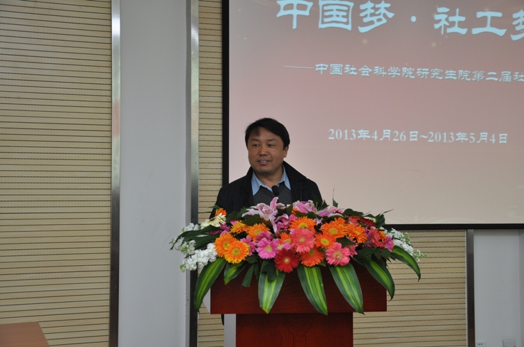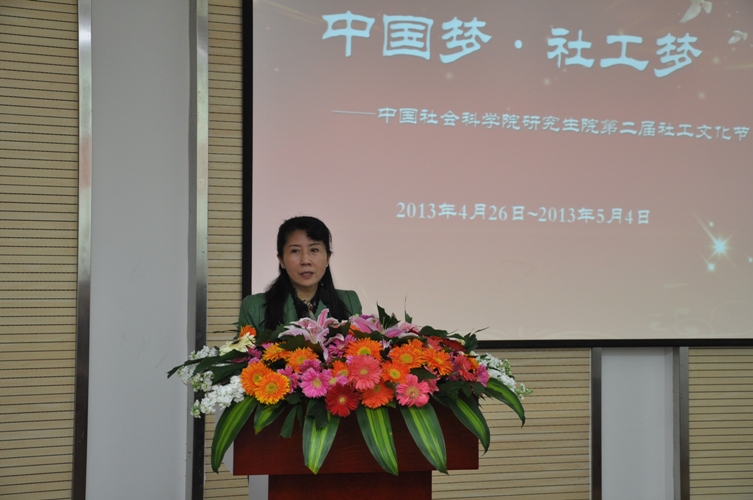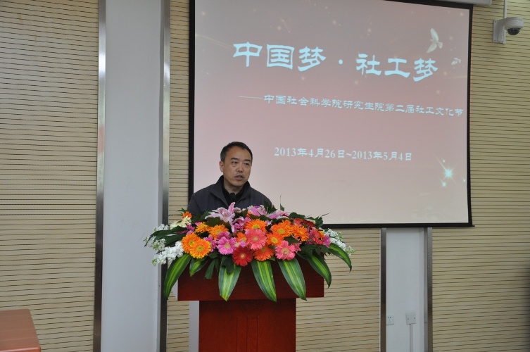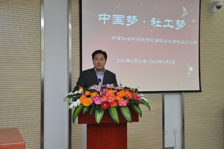 王泳军处长在致辞中表达了对本届社工文化节开幕的祝贺并表示研究生工作处将大力支持此类促进学生交流和丰富学生课余生活的活动。他对社工学生在学校各类活动中的优异表现予以表扬,并预祝本届社工节圆满成功。邱伟立处长在致辞中高度肯定了社会工作硕士教育中心在开展学术交流活动、扩展学生专业视野方面的工作,并希望同学们将拥有梦想和实践梦想相统一,不断努力,梦想成真。石文东主任在致辞中说很高兴参加本届社工文化节开幕式,对社工学生整体呈现出的良好综合素质予以肯定,相信本届社工文化节将会开展得更加丰富多彩。他还表示,物业工作部门也将不断提高服务,为师生创造更好的学习生活环境。