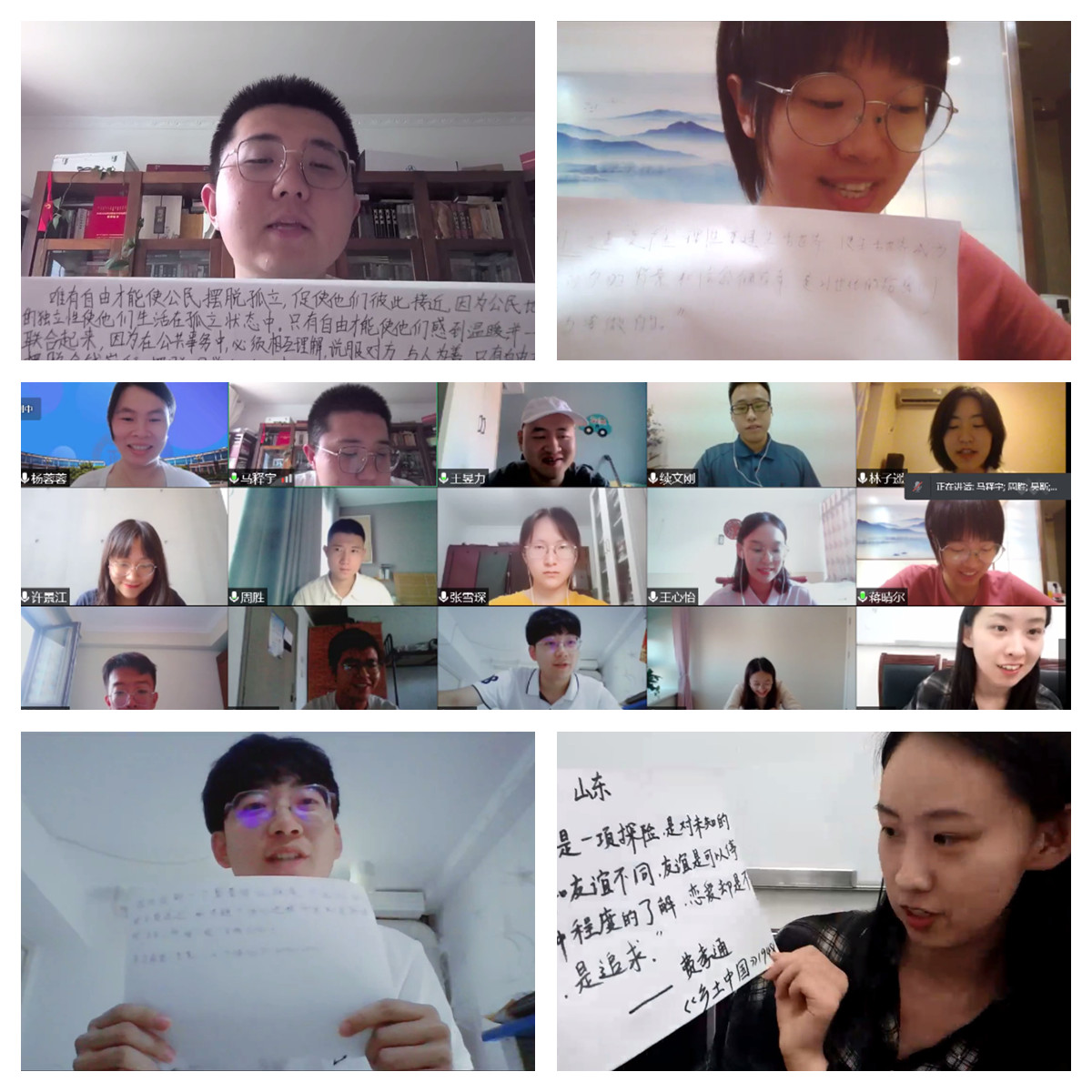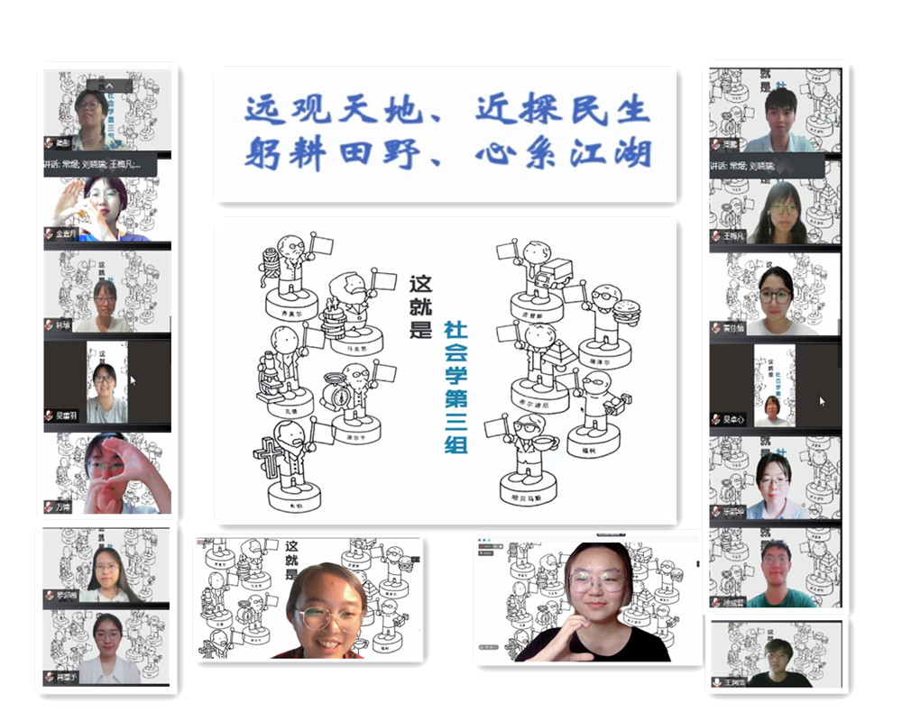 图8-社会学一组展示:按社会学发展的时间脉络,每个同学分享一段从中外社会学家的著作中获得力量的句子。口号:笃学、慎思、明辨、尚行;研精致思,笃行致远;问道求索,经世济民。