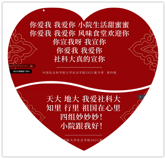考核当日的闭营仪式,社会工作专业分营四个小组和社会学专业分营三个小组,每组有一位营员代表发言,谈体会与收获。接着,每个小组通过口号、手势或其它形式展现小组成员风采。夏令营落下帷幕,营员们学识渊博又多才多艺的形象让人难忘。