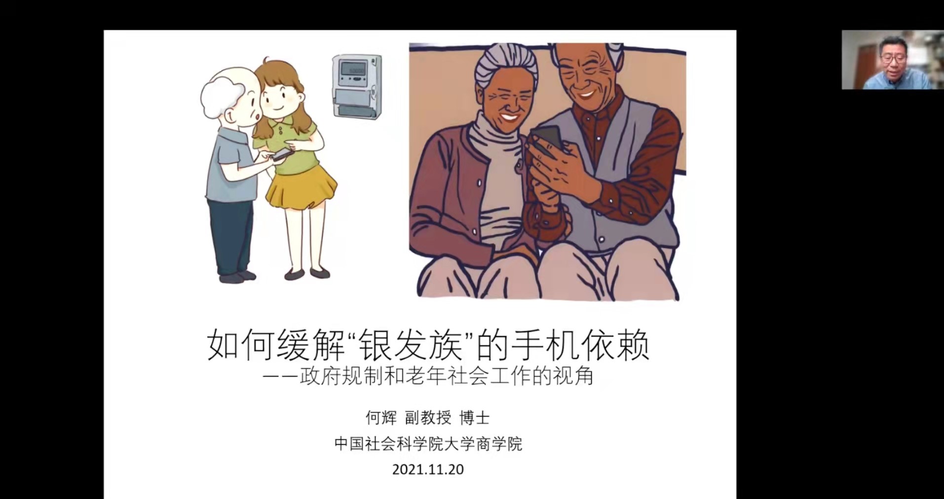 党总支书记、老年学与社区研究中心成员何辉副教授以“如何缓解“银发族”的手机依赖?—政府规制和老年社会工作的视角”进行分享。他在数据对比分析的基础上,对老年人的网络鸿沟和老年人手机依赖进行对比,区分老年人网络鸿沟主要存在于政务类等学习成本较高的App,老年人的手机依赖主要存在消费和娱乐类App。同时对老年人手机依赖产生的内外部原因、机制、影响及应对措施进行分析。根据克莱顿•奥德弗的ERG理论,人们的需求包括生存、相互关系、成长的需求。而老年人群体同样需要相互关系和成长的需求,并进一步从社会推力和商业拉力两个方面分析了老年人手机依赖产生的原因。老年人手机依赖给老年人的身体心理造成一定的不良影响,且容易受商业不道德如敲诈的危害。并基于“扩展的临床视角”下的企业社工干预提出了四个层面的应对措施。我们需要从政府、企业、社会、社工角度采取措施。关注老年人网络鸿沟的同时,更要关注老年人手机依赖,这是否是老年人心理空虚、社交活动缺乏的另一种表现,这也给老年社会工作提出了新的关注点。