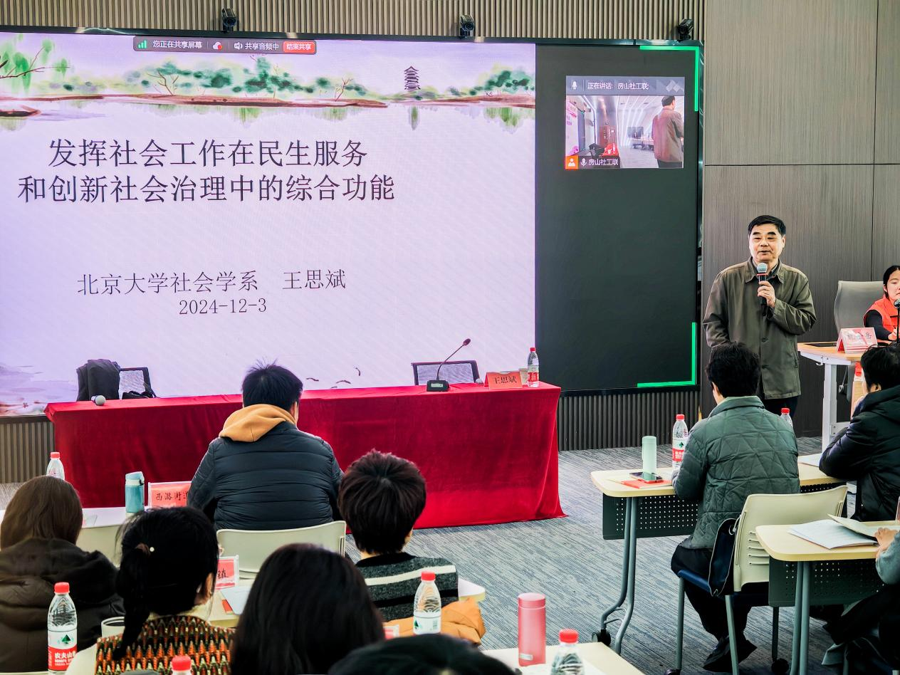 王思斌教授就“发挥社会工作在民生服务和创新社会治理中的综合功能”这一专题进行授课,强调了党中央对于发展社会工作以及推进专业人才队伍建设的高度重视,指出我们要在组织、服务、凝聚群众上改革创新,发挥制度优势,同时用好专业优势,提升职业效能。