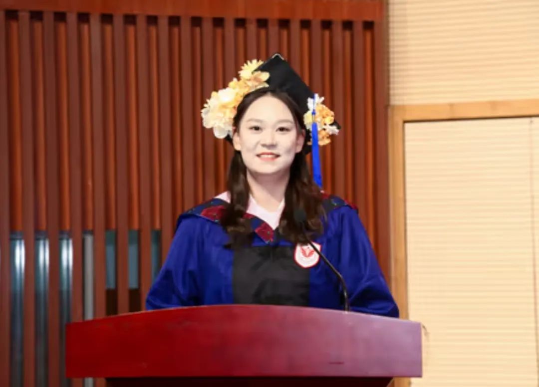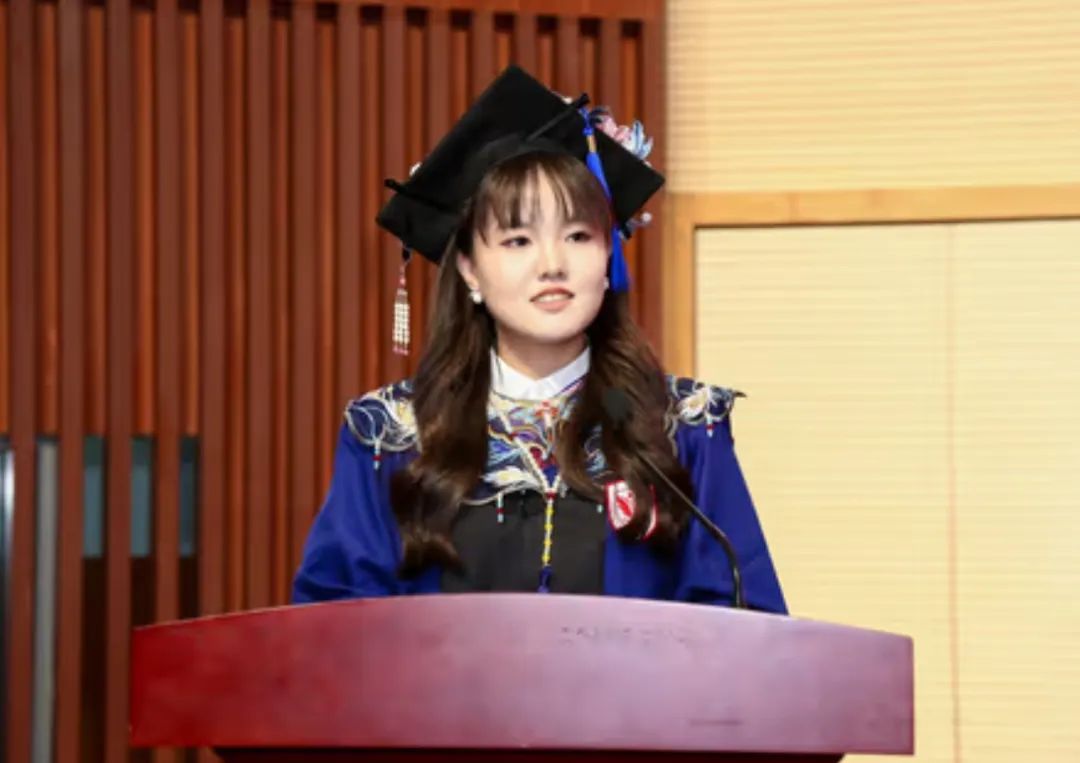 2022级学术型硕士毕业生王心怡代表学术型硕士学位获得者发言。王心怡坦言学术耕耘并非易事,初期生搬理论遭遇挫折,在导师梁晨副研究员“多读、多听、多看”的引导下,她认识到社会科学的生命力在“田间地头、市井烟火”,必须身体力行。她以“花期各异”比喻学术成长之路,分享了自己从焦虑到在田野上收获“小小玫瑰”的心路历程,鼓励同学不必羡慕他人光彩,坚定走好自己的路。她最终找到了社会科学的意义:既要读懂社会,更要建设社会;对他者的关怀与对时代的把握是所有田野工作者的共同底色。她祝愿所有毕业生在新的“田野”中拥抱属于自己的绚烂花海。
