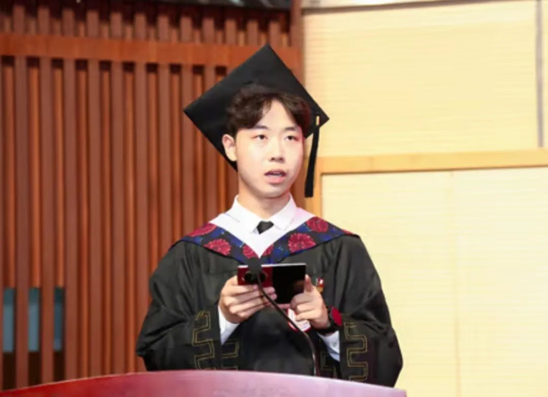 2021级社会学本科毕业生陈鞠之翼代表学士学位获得者发言。他将本科生涯概括为一场社会学的求索、自主的身边探索与生命体验。受益于科教融合优势与社科院雄厚师资,他不仅初窥社会学门径,更深刻理解到做学问需“回到社会、回到人间”。陈鞠之翼感谢恩师的关怀指导以及身边朋友的陪伴,强调四年经历拓宽了认知,深化了对生命的理解。他鼓励大家多尝试、勤学习、保持健康与快乐,在行动与实践中找到并把握自己的人生方向。