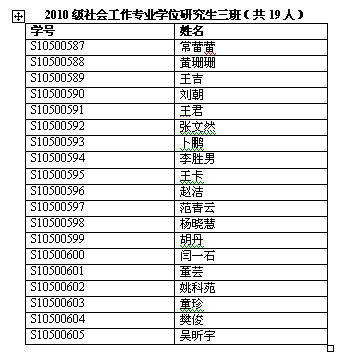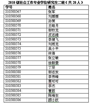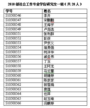 社会工作硕士(MSW)教育中心2010级社会工作专业学位新生共59人,按学号顺序分为三个班。以下是班主任联系方式及新生分班名单,如有特殊情况,请与班主任联系。