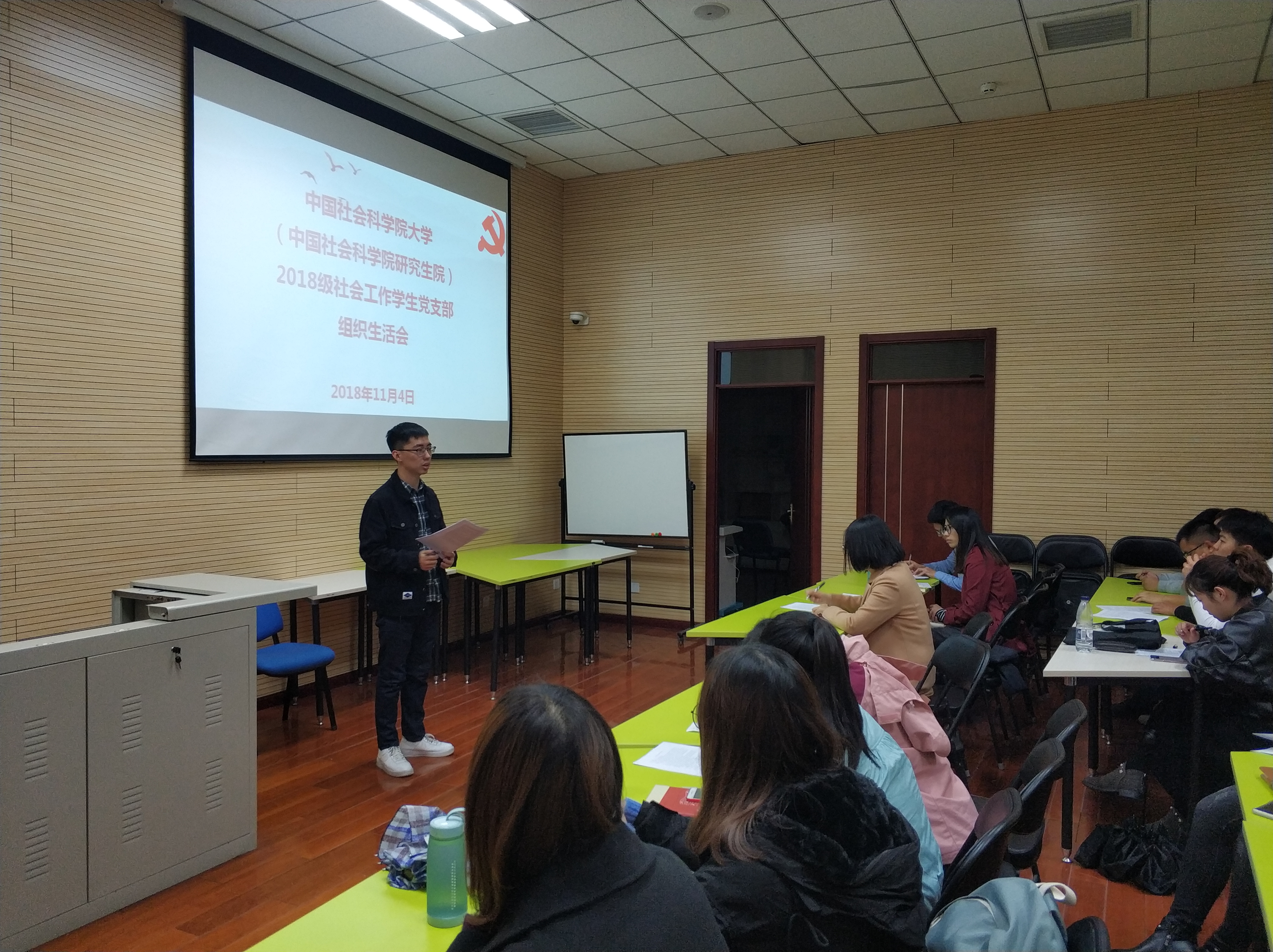 2018年11月4日,2018级社会工作硕士党支部组织生活会在教学楼社工实验室顺利召开。参加本次生活会的有学生工作负责老师赵宗宇以及2018级社会工作专业19名党员同志,本次生活会由一班党支部书记林楠同志主持。本次会议以“不忘初心,牢记使命、坚定党员政治立场”为主题,通过集体学习新修订的《中国共产党纪律处分条例》、观影及分享观后感等方式进行交流探讨。