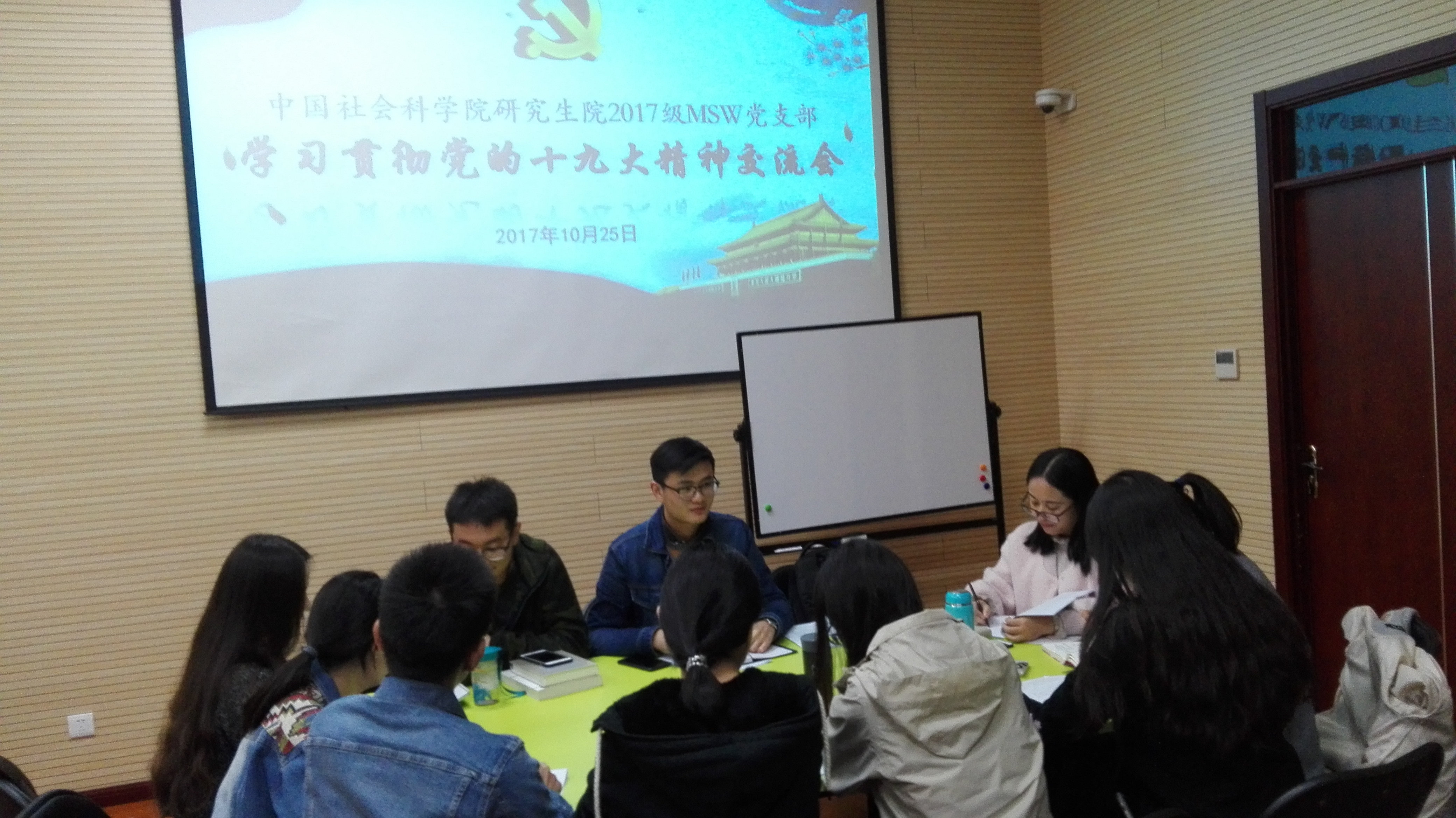 2017级社会工作硕士党支部在教学楼202教室举行了学习贯彻党的十九大精神交流会。会议围绕党员发挥模范带头作用,学习好、宣传好、贯彻落实好十九大精神,进行讨论交流。会议由党支部书记向绪鹏主持,党支部11名党员参加了会议。