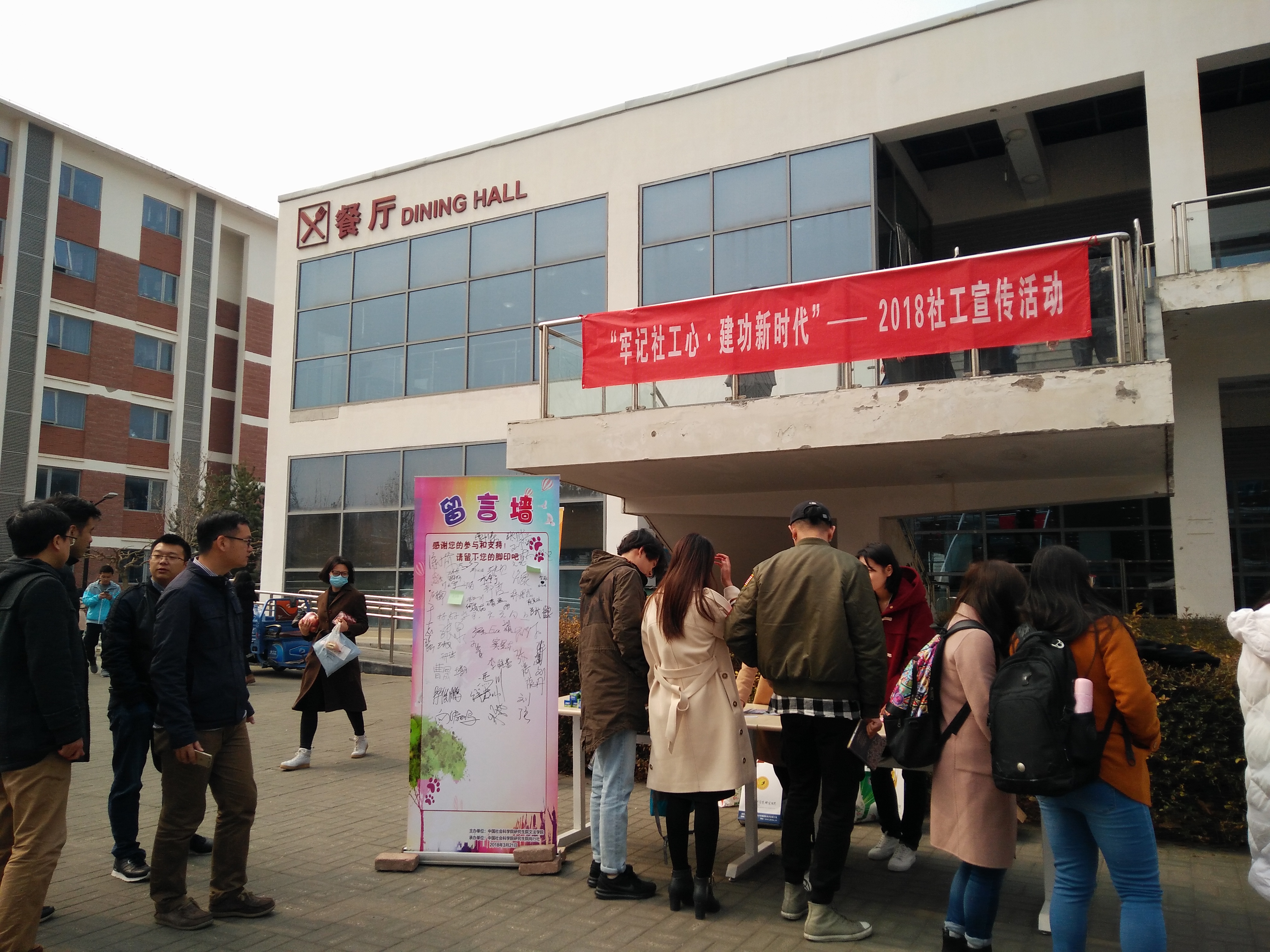 研究生院社会工作硕士教育中心发起了以“牢记社工心,建工新时代”为主题的系列宣传活动。此次活动于2018年3月19日至25日进行并由尚行社承办,活动主要目的是为进一步提高社会工作的社会认知度和影响力,充分展示社会工作者的专业形象和服务成效开展的系列活动。活动主要开展了社工知识宣传和竞答环节、留言墙活动及打工子弟学校的社工服务活动。