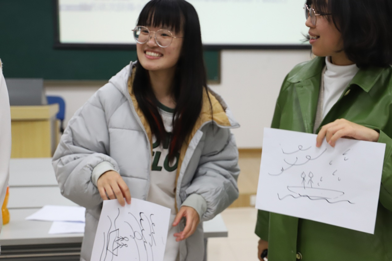 这一阶段的分享后,同学们又玩了抢凳子、你画我猜的游戏,你画我猜结束后,大家带着笑容,收起了各自创造的杰作。