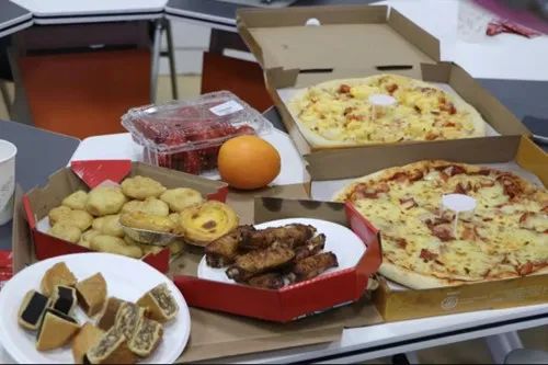班会以冷餐会拉开序幕。中午11:00,班主任周少贤老师与同学们精心准备的美食摆放在教室的长桌上,诱人的食物香气顿时弥漫了整个教室。披萨、月饼、新鲜水果,还有周老师亲自烤的鸡翅和可口的饮料,琳琅满目的美食令人垂涎。