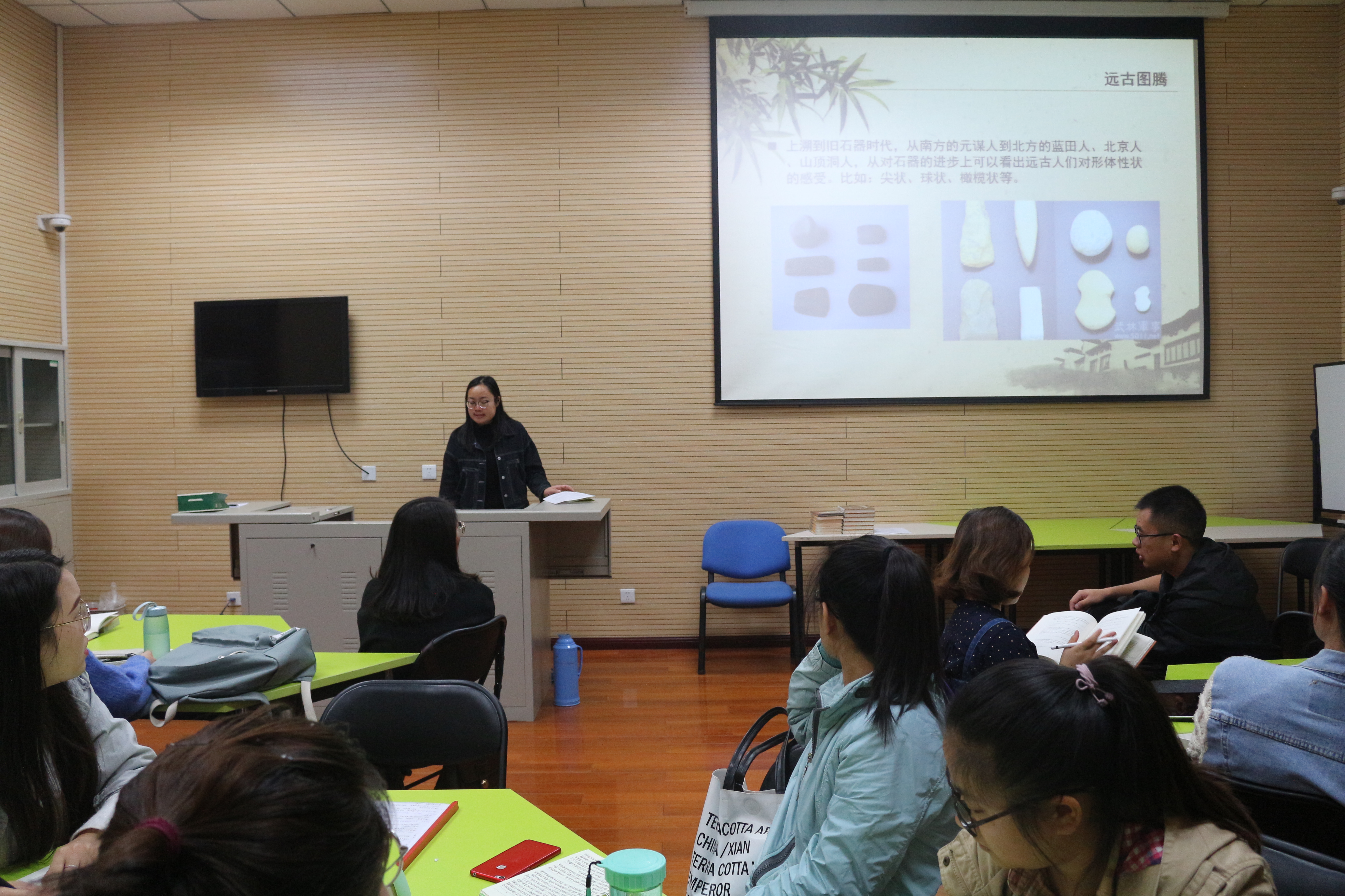 小组展示环节中,各组都选择了本组最为感兴趣的章节,并向大家展示了相关的历史背景、美学知识、古董藏品等丰富的内容。有的介绍了原始图腾、原始歌舞的含义并总结为“有意义的形式”;有的通过大量的图片展示了青铜饕餮的狞厉之美以和以汉字为代表的“线的艺术”;有的以对“佛”的看法为核心,从壁画和佛像雕塑在隋唐、唐、晚唐三个朝代的改变中发现其世俗化的历程;有的运用“国宝档案”视频带我们穿越长安,领略盛唐之音;有的寄情山水,启发同学们回归自然,欣赏自然之美。其中,第一组的同学为我们带来了以“明清文艺思潮”为主题的精彩展示,赢得了大家的频频掌声,他们从市民文艺到浪漫洪流,从感伤文学到《红楼梦》,清晰而生动地梳理了明清文艺之美,“黛玉葬花”这段视频更是把读书会氛围推到高点。