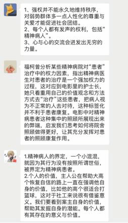 疯子?到底什么是疯子?这是这部电影给我们的第一个问号。一谈到疯子很多人会与不正常联系在一起,那么究竟什么是正常?建构理论认为,社会是被建构出来的。也就是说,所谓的“正常”只是大部分人所表现出来的行为习惯而已,当少数人表现的与大多数人不一样时,他们便被贴上了“不正常”“疯子”的标签,继而被采取非正常化的方式对待。社工一个有温度的专业,一个有灵性的职业,在社工的世界观里,所谓的疯子和不正常人只是与一些人不一样而已,我们要学会接纳而不是排斥。