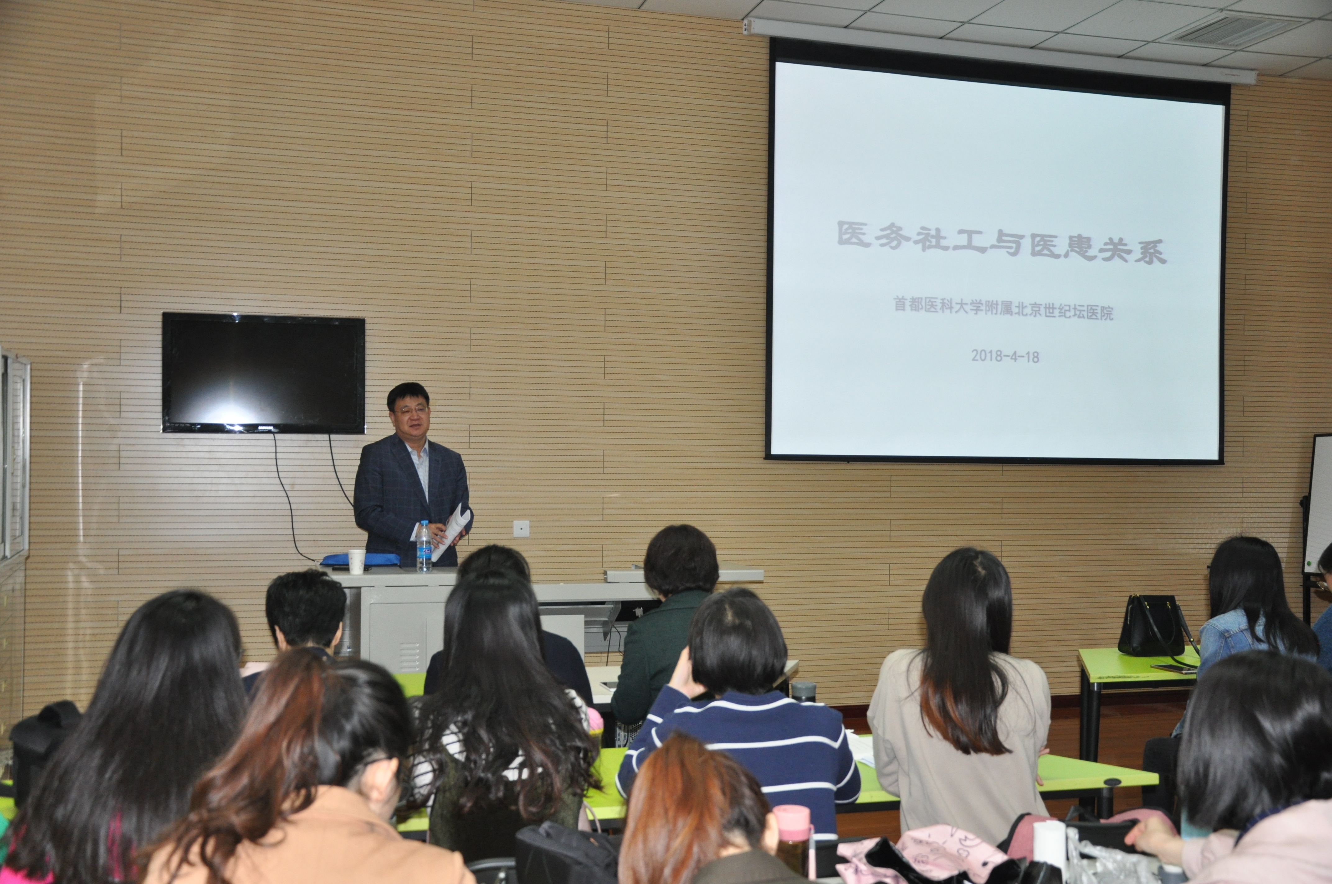 2018年4月18日上午9:30,首都医科大学附属北京世纪坛医院医务处王勇处长受邀为17级社工硕士作了以“医务社工与医患关系”为主题的讲座。北京世纪坛医院医务处吴薇主任、黄荷老师以及中国社会科紳士漫畫