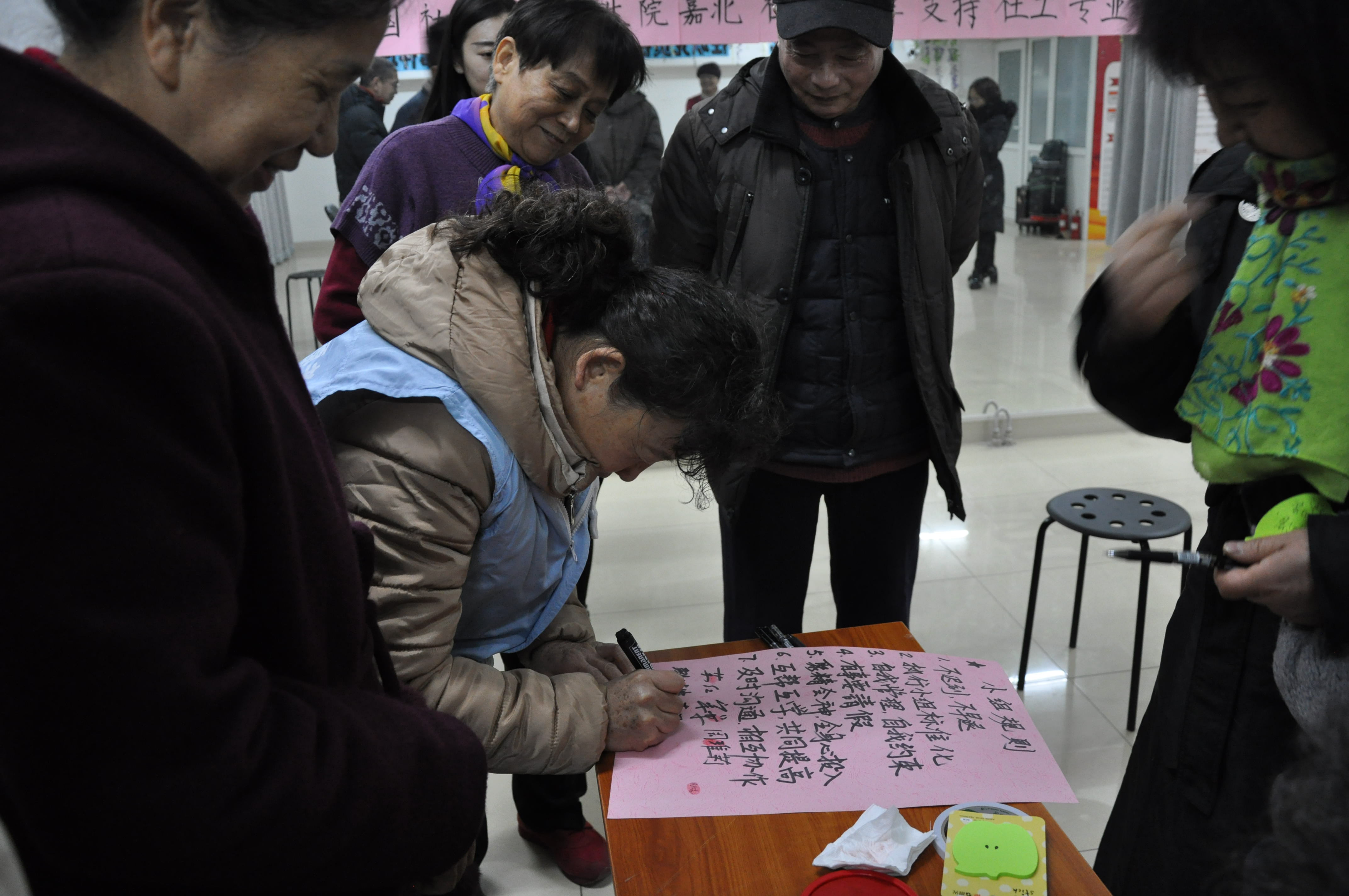最后,为了保证随后五次小组活动的顺利进行,达到社区社会组织之间加强沟通、支持共享的目标,在社工的引导下,小组成员积极参与发表见解,贡献才智,共同订立了小组名称、口号和小组规范,本次小组活动也受到了嘉北社区居委会李主任及工作人员的充分肯定,活动取得了圆满成功。