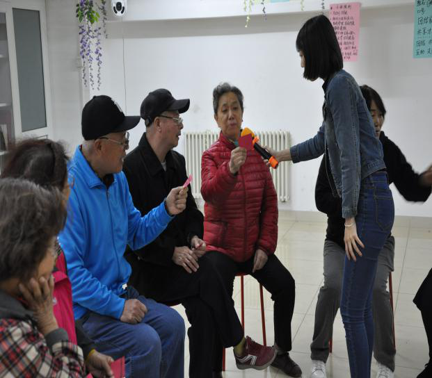 社工申丽鑫带领小组成员对上次的活动进行了系统回顾,并与组员一起重申了小组名称、口号及小组规则。接下来,社会工作者运用小游戏“同一首歌”将小组成员随机分组,此时小组成员的活动积极性被唤醒,完全投入到小组中来。
