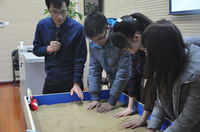 培训伊始,田老师请了三名同学上台亲自体会玩沙的感觉,在老师的引导下三位同学闭上眼,感受沙子的细腻和柔软,而后三位同学表示沉浸在沙的世界里会让人觉得很放松。的确,田老师指出,沙游能促进个体化的过程,让人释放创造力、内在感觉、知觉和记忆,并将他们带到外在现实且提供具体证据,它可以利用大部分的感官,提供一种扩展性的体验。