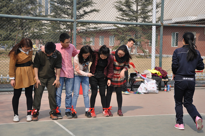 第二部分是游戏接龙,此部分由单人跳绳、踢毽子、背投球、夹豆子、集体大跳绳等若干个独立游戏连接而成,团队成员需相互配合,以最短的时间完成所有项目。这个游戏成功的增强了成员之间的合作能力,培养了团队内部相互协作的默契。
