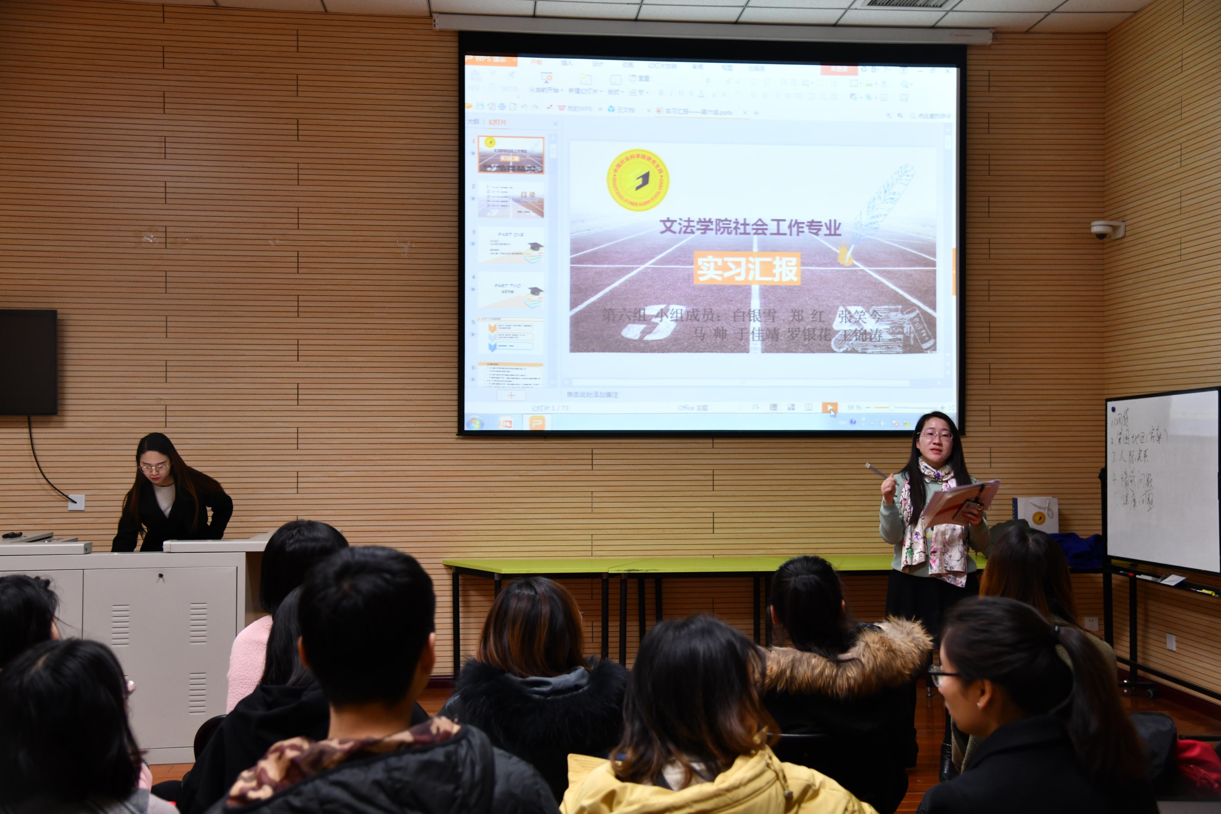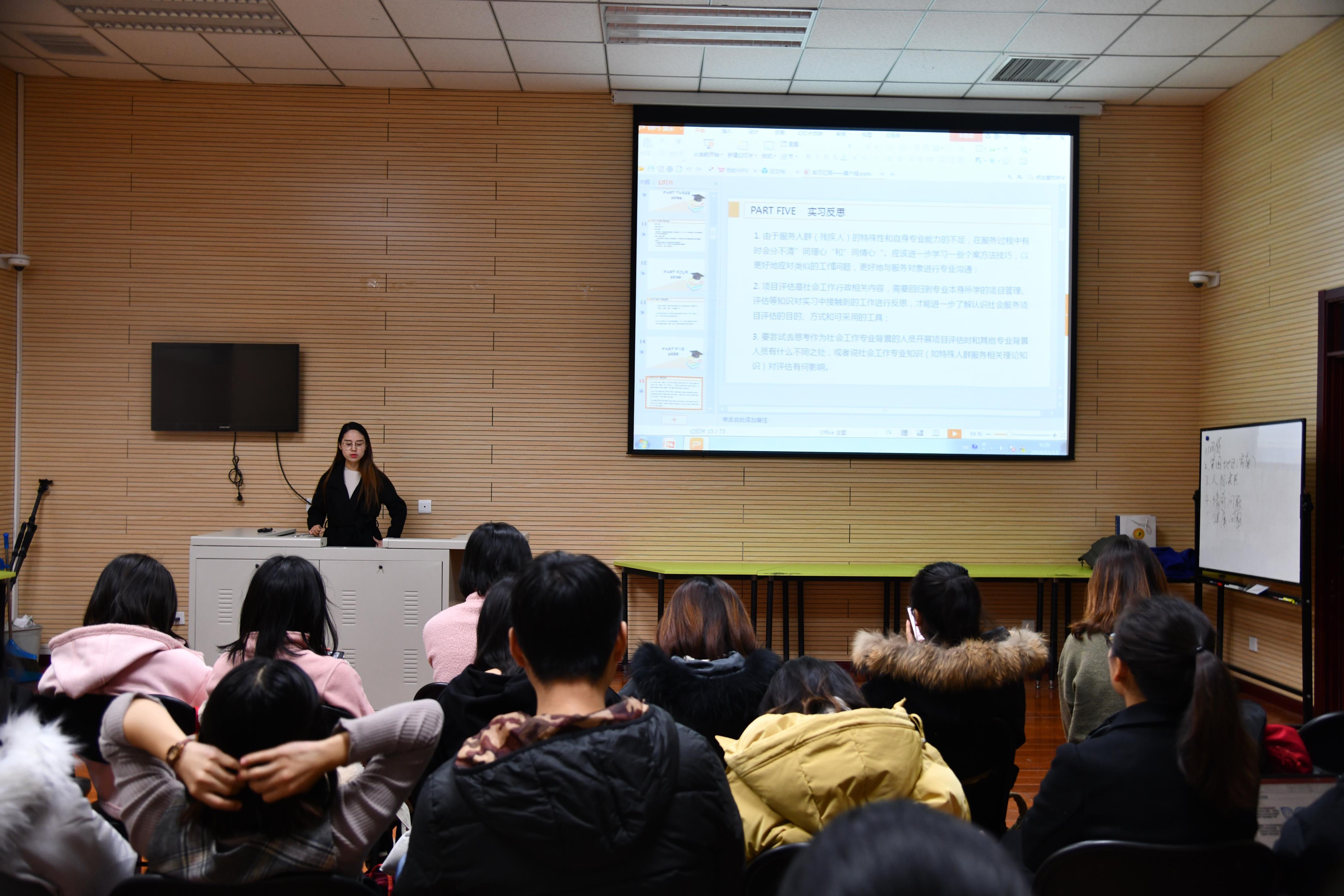 答辩按照现场抽签顺序进行,52位同学以小组为单位轮流上台做了总结汇报。同学们为总结答辩进行了充分的准备,展示了丰富的资料和照片,在简要介绍实习机构和实习内容的基础上,着重展示了实习中的特色工作,并对实习收获与经验、问题与专业反思做了较为深刻的分享。