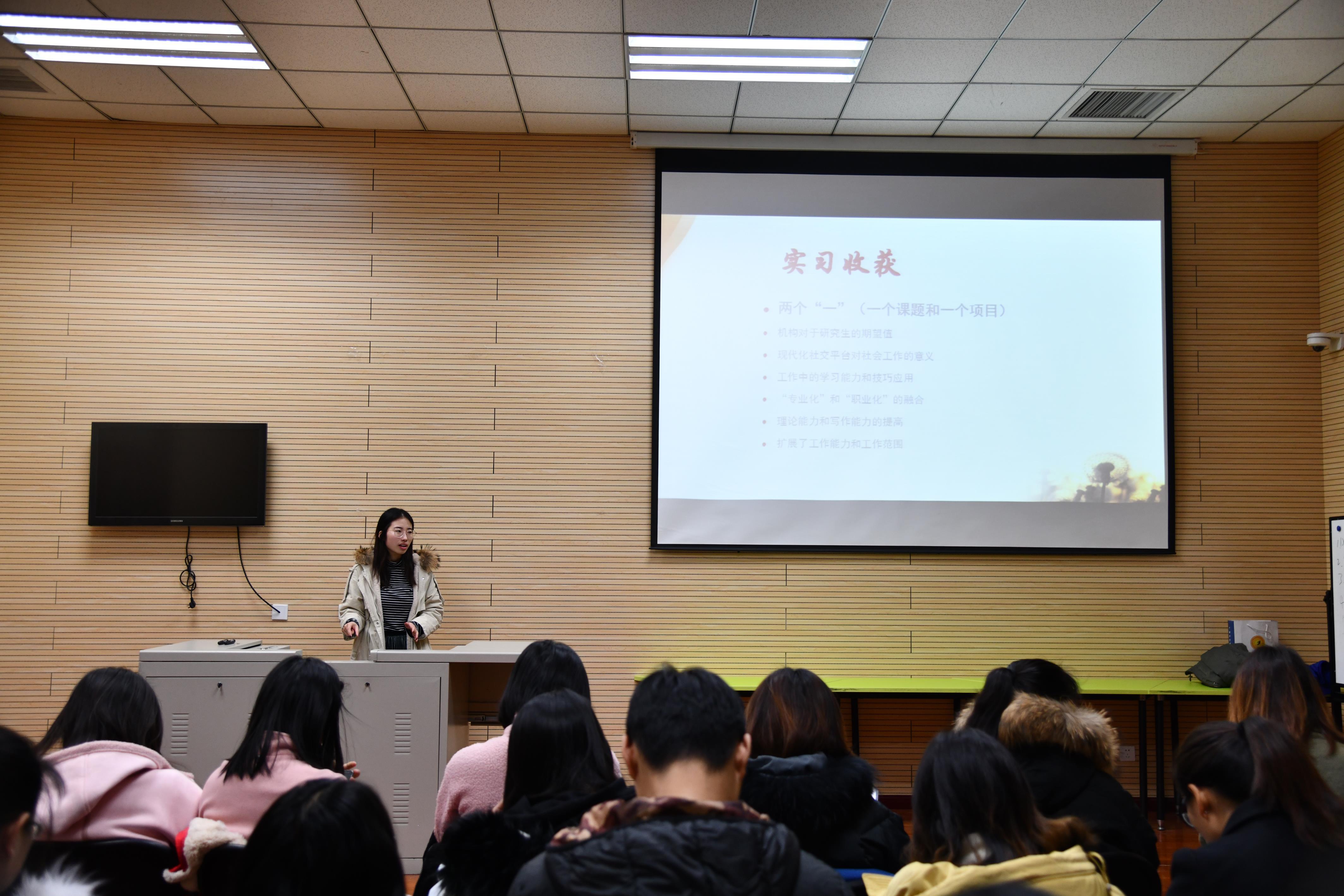 同学们的实习涵盖了老年社会工作、医务社会工作、司法社会工作、儿童社会工作、精准扶贫等不同领域,还包括社会调查、政策研究等方面的工作,大家分享的内容让其他同学对许多未亲身接触过的领域也有了更多的了解。而从事相同领域实习,甚至是来自同一机构的同学也带来了各自不同角度的思考,对于个人成长、专业技能、知识体系、行业发展都有着独到的见解。通过同学们的实习汇报,能够感受到MSW学生对专业实习饱满的热情、认真的态度和严肃的思考,也能感受到同学们对未来职业生涯规划的理性思考。