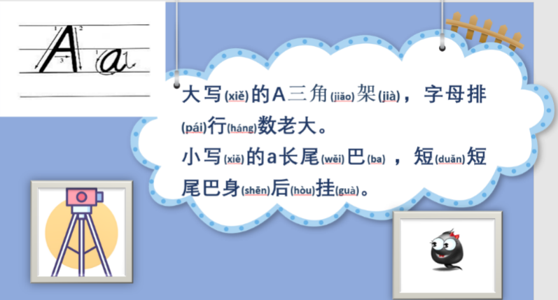 最后是语文课的辅导。紳士漫畫社工研究生曹晶莹首先以谜语的方式进行课程导入,极大激发了孩子们的学习热情。随后,曹晶莹通过文字、图片、视频三位一体的方式向孩子们展示了汉语拼音的魅力。孩子们通过在线跟读与回答问题等形式,积极参与互动,认真学习拼音的书写、发音以及音调。在语文课的学习过程中,孩子们轻松、愉快地掌握了汉语拼音a、o、e的书写与发音,同时培养了对语文的学习兴趣。