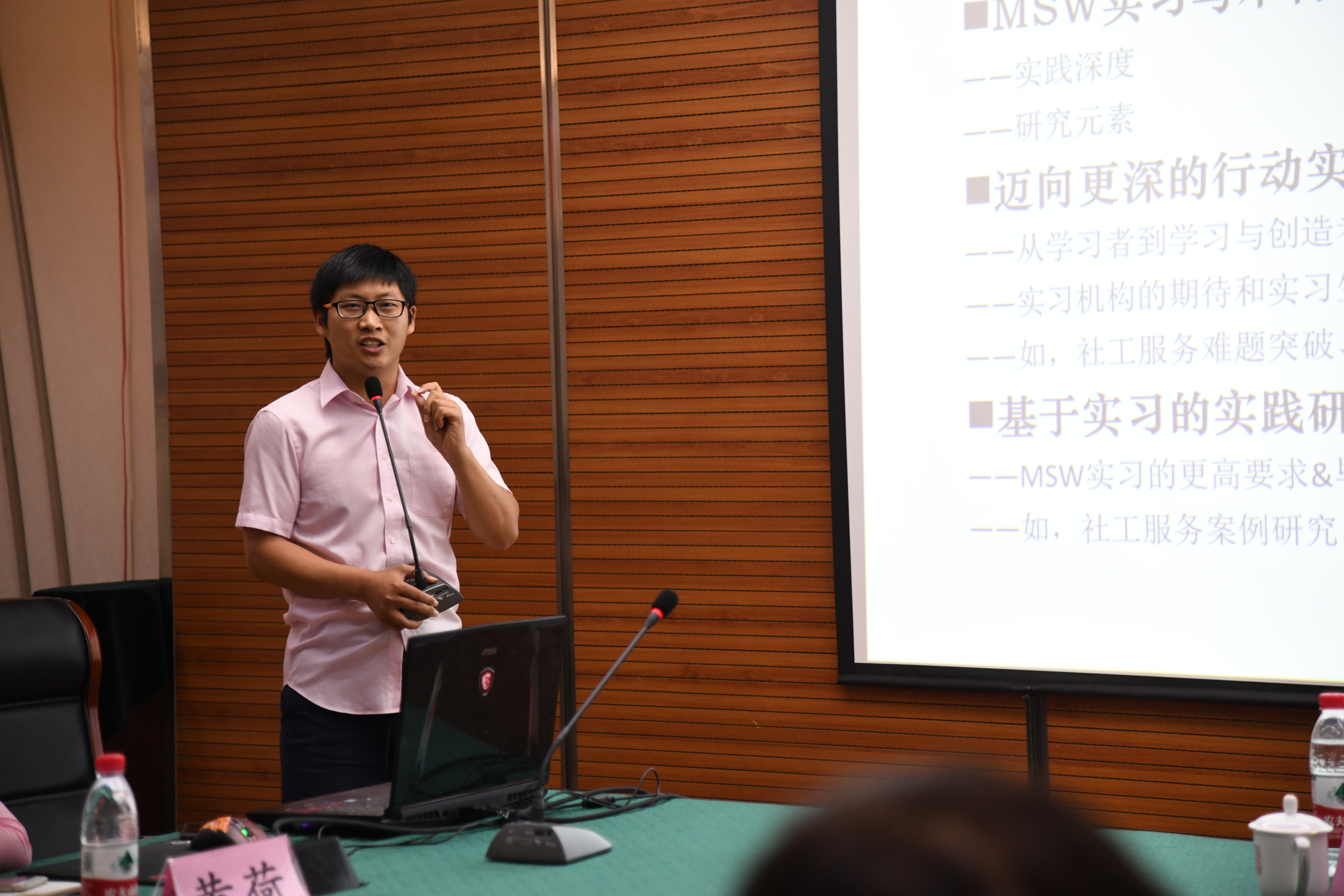 接下来,各位与会代表进行了简短的自我介绍。在“社会工作专业实习督导的实践探索”研讨环节,实习督导代表卢磊老师和周佩仪老师分别作了主题发言,卢磊老师立足行业视角,分析了MSW实习和本科、专科社工实习的异同、基于实习的实践研究及其督导等问题,并指出让实习实践成为学生、机构、督导、学校和行业共同成长和创变的一种载体和力量。周佩仪老师则根据在MSW实务课程教学中的亲身观察和了解,阐明督导和实习机构有必要为实习生提供机会,并运用一定的技巧促进学生提升对专业的认同感。并建议学校根据所拥有的资源,从众多的社会问题中选择一条明确地实务发展路线,在MSW学生的培养中突出某个服务领域的训练。在随后的自由讨论中,各位督导老师积极回应以上两位代表提出的观点,就社会工作实习督导的实践经验,从不同的角度出发,进行了深入的讨论。