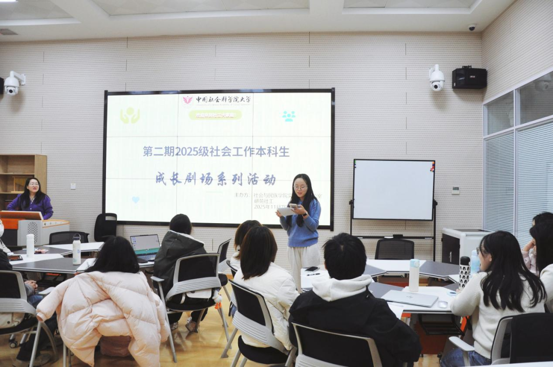 实习实践办公室主任郑玲老师主持,25级研苑社工编辑部的硕士师姐们协助。本次活动通过观影、互动答题与小组讨论的形式,助力新生在专业认知与价值塑造上实现初步成长。