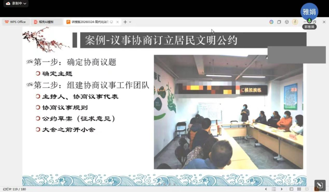 第二场讲座,郭雅娟老师从国家治理现代化的宏观背景谈起,阐明了议事协商是全过程人民民主在基层的生动实践。郭老师提出,现代社区治理已从社会管理转向社会治理,关键要以党建为引领,依托五社联动机制,吸纳两企三新等多元力量,实现共建共治共享。她还强调,议事协商不只是解决问题的手段,更是通过大家理性商量凝聚社区共识、筑牢彼此信任的重要途径,这一理念的深化也与政策发展一脉相承。
