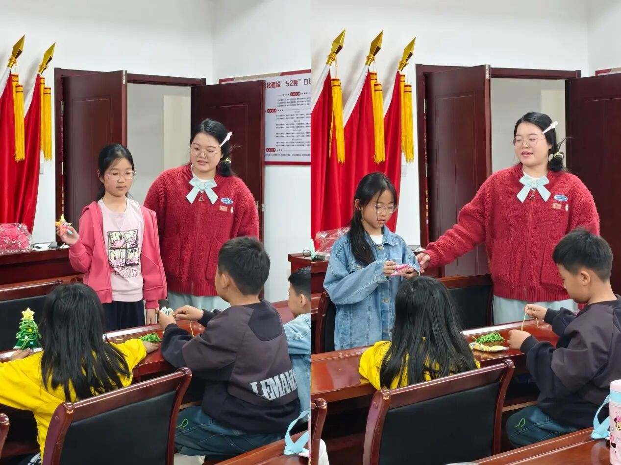 创作过程中,社工全程巡回支持,重点关注羞怯组员,给予低干扰陪伴与协助;鼓励组内轻量互动,引导孩子们互相分享创作灵感与手法。指尖穿梭于毛线之间,压力与烦躁在重复缠绕的动作中慢慢消解,不少孩子边创作边与同伴交流,现场氛围温暖而治愈。