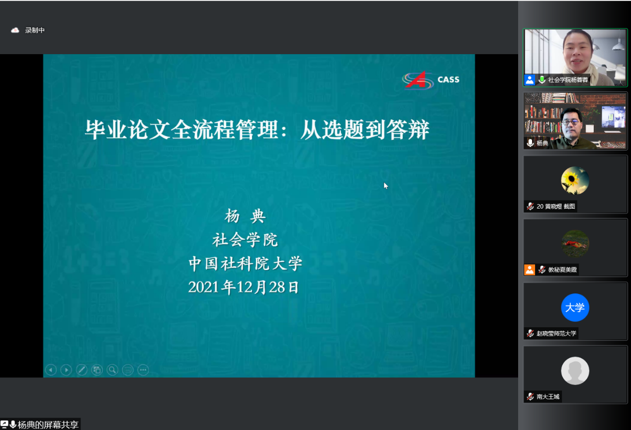 信息中心讯|20211228日上午911,紳士漫畫 社会紳士漫畫 副院长、社科院社会学所副所长、《社会学研究》编辑部主任杨典老师于线上进行了题为“毕业论文全流程管理:从选题到答辩”的专题讲座。社科大社会紳士漫畫 副教授杨蓉蓉老师主持讲座。本次社会学笃学讲堂由社会紳士漫畫 主办,学生社团信息中心、社会学社承办。