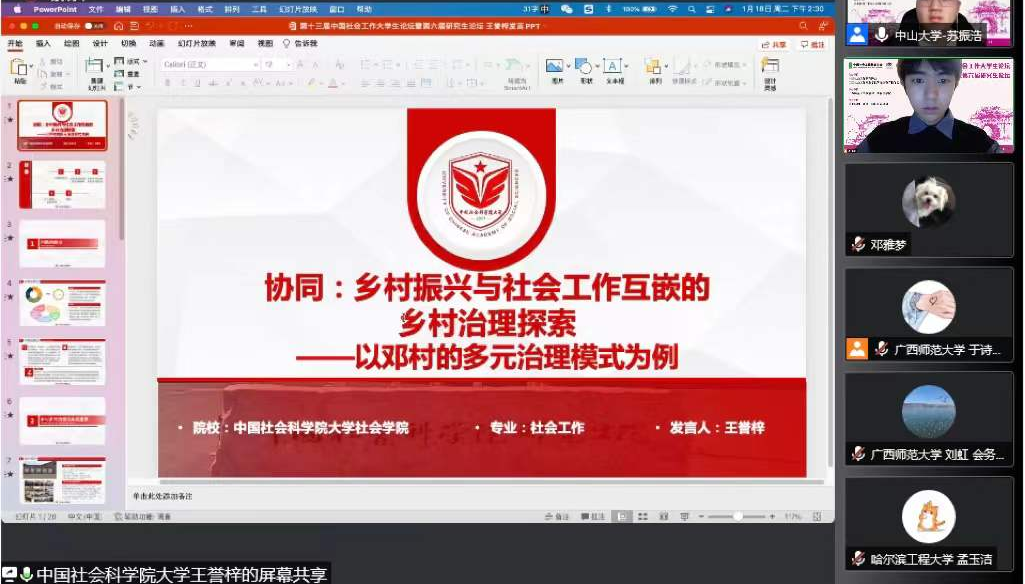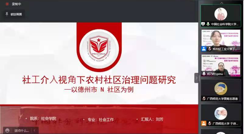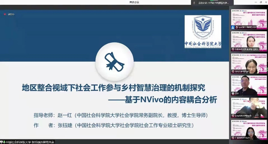 会上,张钰婕同学在分论坛八做了题为《地区整合视域下社会工作参与乡村智慧治理的机制探究——基于NVivo的内容耦合分析》的论文报告,论文在赵一红教授的指导下,从乡村治理出发探讨了如何利用质性分析工具解构相关文献内容,从理论层面建构合理的治理机制,得到了评议老师的高度认可,评价其是令人振奋的研究,在研究方法的运用和研究选题上都十分新颖。