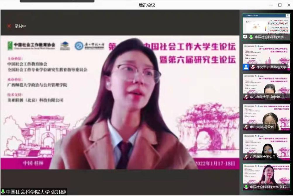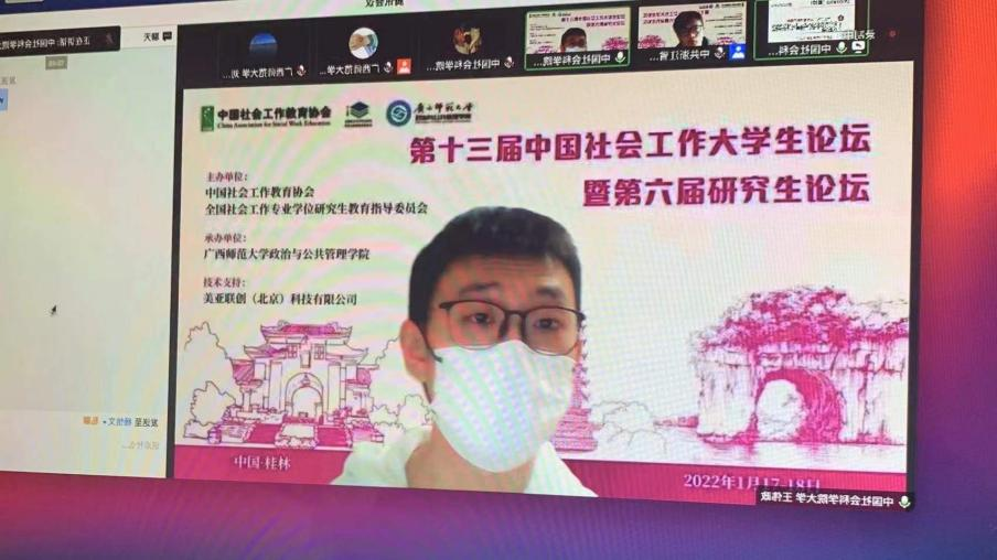 202211718日,紳士漫畫2021级社会工作硕士研究生刘芳、王伟政、王誉梓、张钰婕四名同学参加了由中国社会工作教育协会、全国社会工作专业学位研究生教育指导委员会主办,广西师范大学承办“第十三届中国社会工作大学生论坛暨第六届研究生论坛”,广西师范大学林春逸教授,中国社会工作教育协会王思斌教授、关信平教授、彭华民教授、顾东辉教授出席会议。来自北京大学、南京大学、复旦大学、南开大学、中国人民大学等全国各地300多所高校近400名本硕博社会工作专业师生齐聚云端,参与这场学术的“饕餮盛宴”。在此次论坛中,张钰婕同学获得了硕士组二等奖,刘芳、王伟政、王誉梓同学获得了硕士组三等奖。