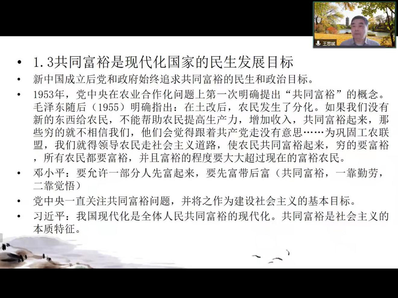 在讲解完乡村振兴后,王老师和大家讨论了共同富裕。他指出共同富裕是现代化国家的民生发展目标,从新中国成立到改革开放,人民富裕一直是我们党工作的重点,又指出党中央对共同富裕的定义和要求,概括来讲就是坚持以人民为中心的发展思想,在高质量发展中促进共同富裕。