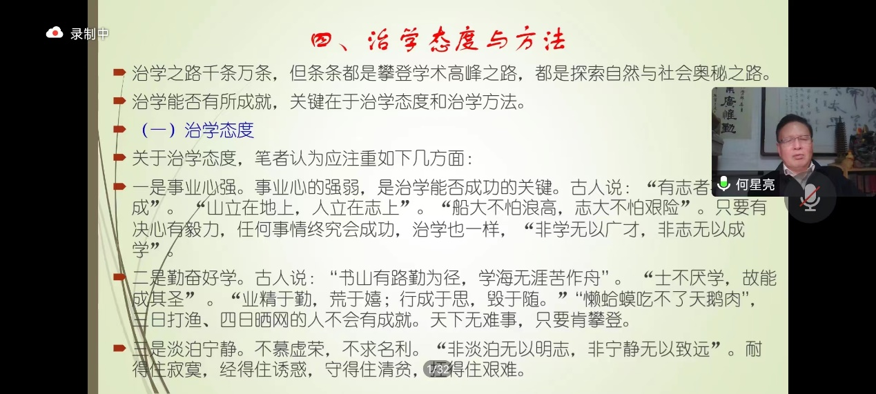 何老师总结自己的治学特点,表示自己走的是“从树木到森林”“先专后通”的道路,在研究中学习,在研究中扩大知识面。边研究、边学习,科学处理好“专”与“通”或“专”与“博”的关系,既出了成果,又学习了新的知识,不断地扩大自己的研究领域;同时要注重基础研究与应用研究相结合、专题性研究与综合性研究相结合,在相互交织中不断丰富自己,在研究中注意历时性与共时性的结合,在广阔的时空尺度中思考问题,要注意论证的逻辑严密,学习多重证据相结合的方法,完善自己的论证与研究。