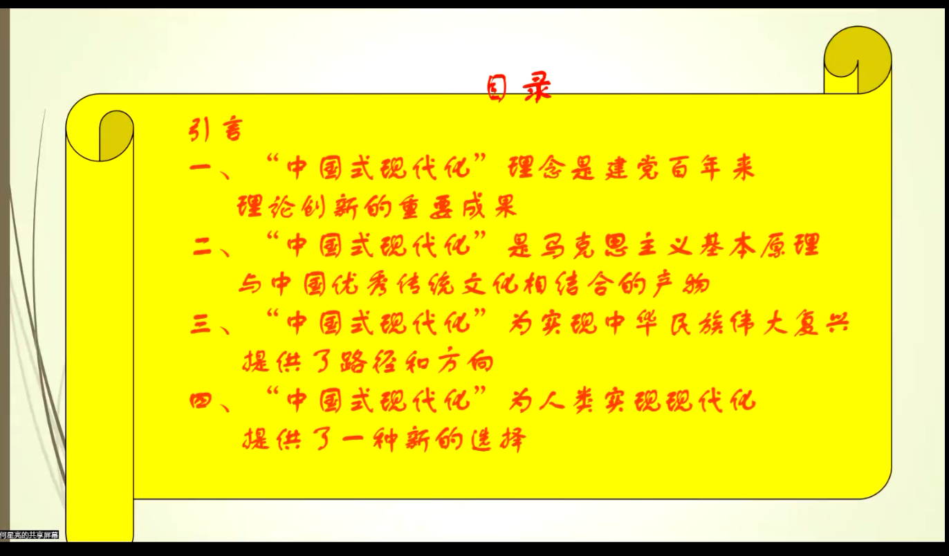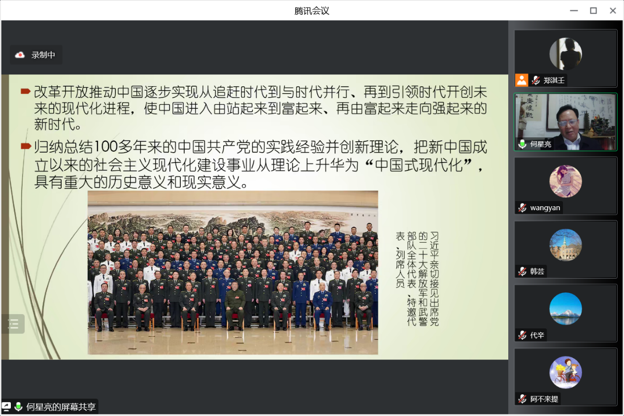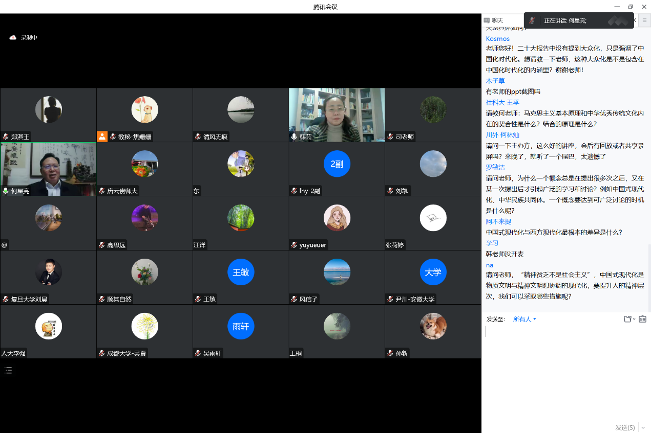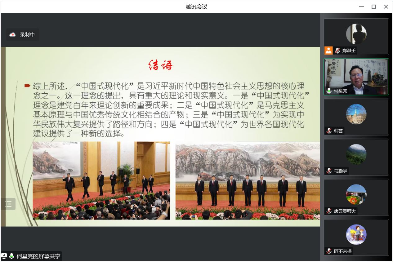 接下来,何老师向我们阐述了“中国式现代化”是马克思主义基本原理与中华秀传统文化相结合的产物这一论点。毛泽东早在上世纪上半叶便强调民族自信和文化自信。十八大以来,习近平继承和发展了毛泽东思想,提出了“文化自信”的理念。“中国式现代化”理念具有深厚的中华文化根基。“中国式现代化”是马克思主义基本原理与中华优秀传统文化相结合的产物,是符合中国国情、历史和文化传统及民族特点的现代化道路,是在古代中华文明发展道路基础上的创新性发展和创造性转化。当代中国人继承和弘扬祖先的创新精神,在古代中华文明的基础上创新,形成了形成“中国式现代化”发展道路,创造了与西方文明不同“人类文明新形态”。