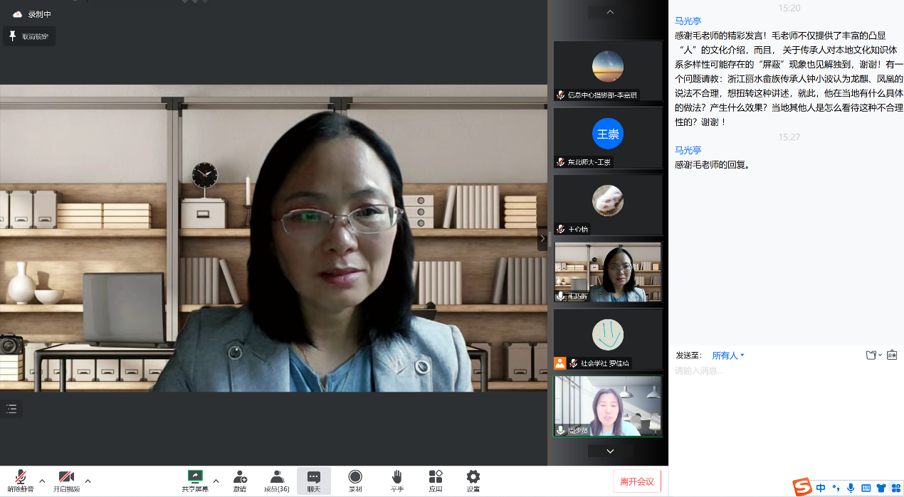 毛老师为同学们大体梳理了我国有关民间传承人的研究,介绍了传承人研究的变化节点,帮助同学们了解我国非遗传承人研究的现状。在研究的过程中,非遗语境中民间文化与传承人身份也在发生改变,民间文化开始作为“文化”展示给“他者”,也成为“有利可图的资源”,在遗产化的过程中,非遗项目被社区主导、参与的特性也在逐渐变化,在此过程中,传统民间文化资源的底层、边缘性也被改变,成为开始进入国家话语的文化资源。传承人不再仅仅是地域文化的自然传承者,他们往往只有符合文化部规定的传承人评审标准以及按照其规定程序才能进入国家非遗传承人系统,并享受传承人相关的待遇及其资源。由于非遗转化为“可被展示”的地域文化资源,这就在一定意义上要改变传承人的“地域”特性,也就是说传承人要有进入国家传承人话语体系的公共认可度。