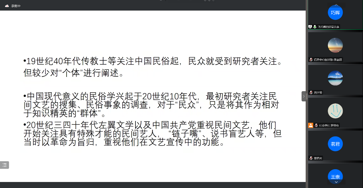 讲座开始,毛巧晖研究员为同学们梳理了我国民俗学的发展过程,自十九世纪四十年代传教士关注中国民俗开始,民众的研究就是研究者关注的重点,对“个体”的阐述较少。中国现代意义的民俗学兴起于二十世纪10年代,研究者们关注民间文艺的搜集、民俗事象的调查,但是,对于“民众”只是将其作为相对于知识精英的“群体”。二十世纪三四十年代开始,左翼文学以及中国共产党开始重视民间文艺,以革命为旨归,重视其文艺宣传功能。建国以后,国家开始重视民族文化遗产的保护与搜集,从文化政策到具体文化实践都较为重视“民间艺人”,但是这种对于“个体”民间艺人的研究一度中断,并且在二十世纪七十年代民俗学复兴时,也未能得到沿承。