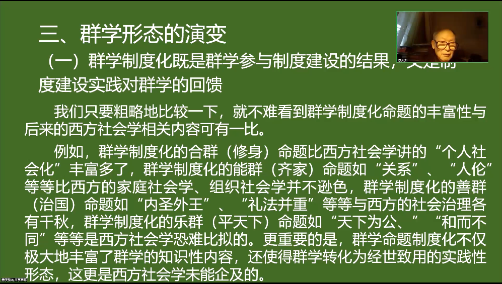 在这一部分,景老师从三个方面来论证了群学相态的演变历程。