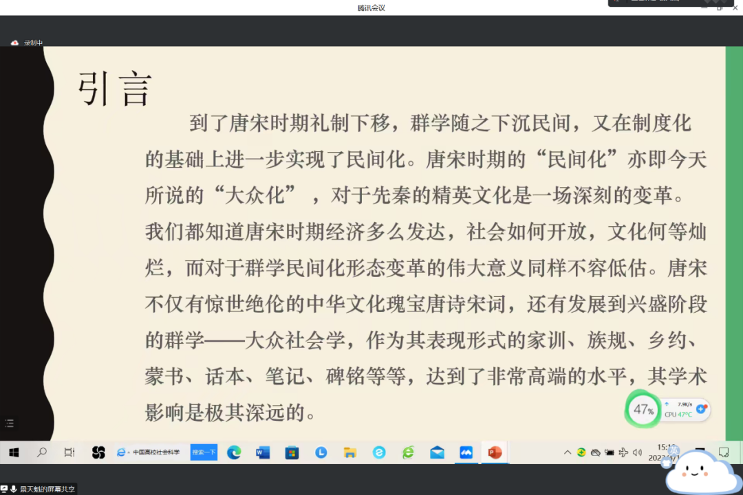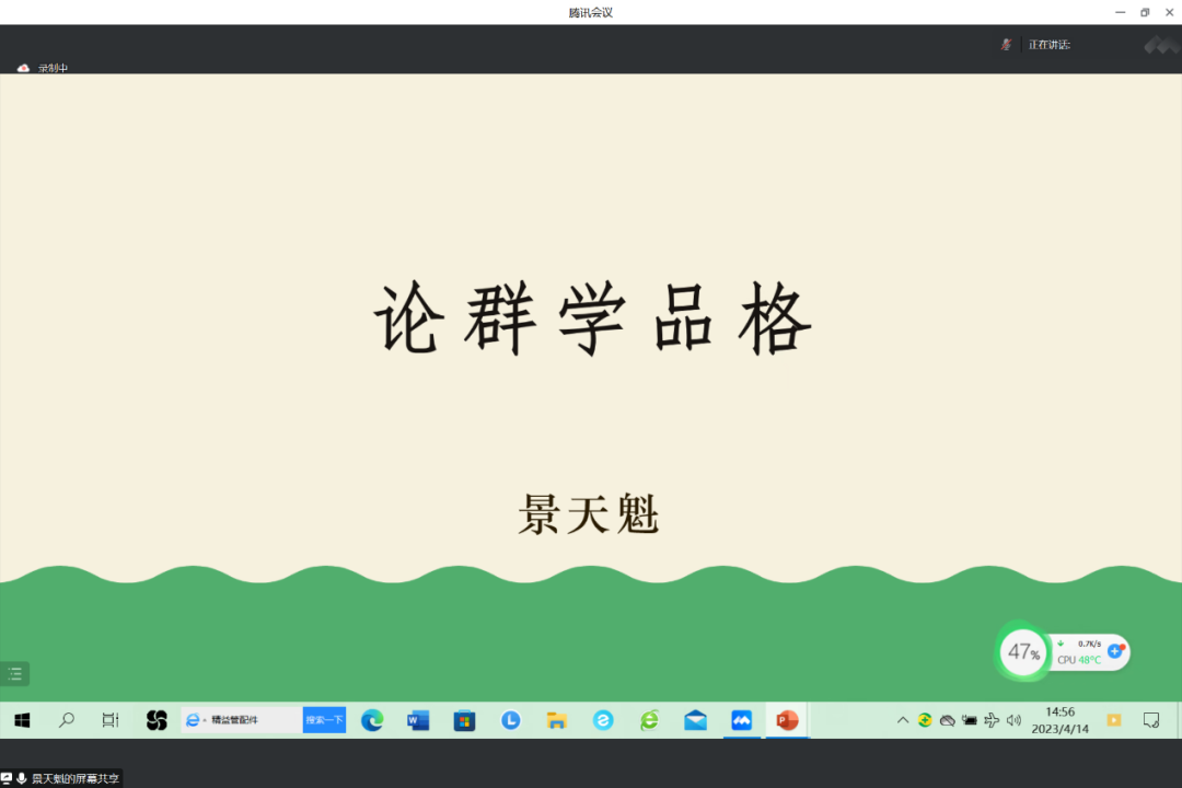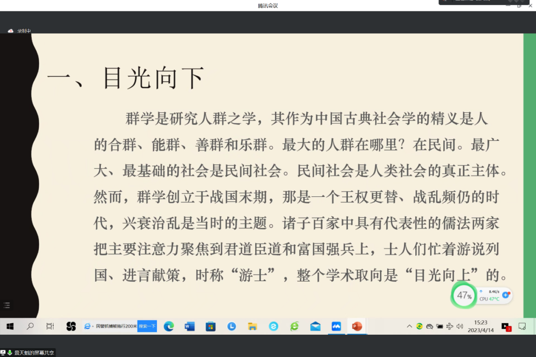 这一次讲座的题目中有一个“品格”,这一种表述一般是用于形容一个人的,但在这里用于形容发源于中国本土的社会学脉络——群学。它起源于战国时荀子的学说,是一门为了人民的学问,它的品格就是人民性。今天景老师将从唐宋时期群学的发展,呈现出群学的品格。为我们今天建设中国特色社会学带来启发。