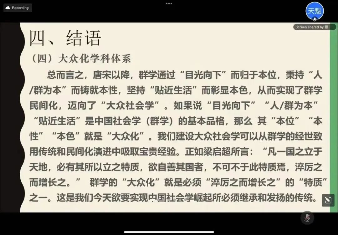 最后景教授总结:大众化问题是当代中国社会学的关键问题,而群学的发展历程就能给我们很大的启发。我们要建立大众社会学,这并非与“小众社会学”相排斥,二者要相互学习,相互补充,最后的目的仍然在于让社会学变成大众化的知识,这是学术发展的基本规律。社会学人应该深入基层,深入民众生活,开展调查,在融入社会的过程中建设社会学学科。同时还要让社会学的知识采取更为大众化的表达形式,在多个领域融会贯通,让其成为大众接受的知识。想要实现中国社会学的崛起,就必须重拾这些群学的大众化特质。
