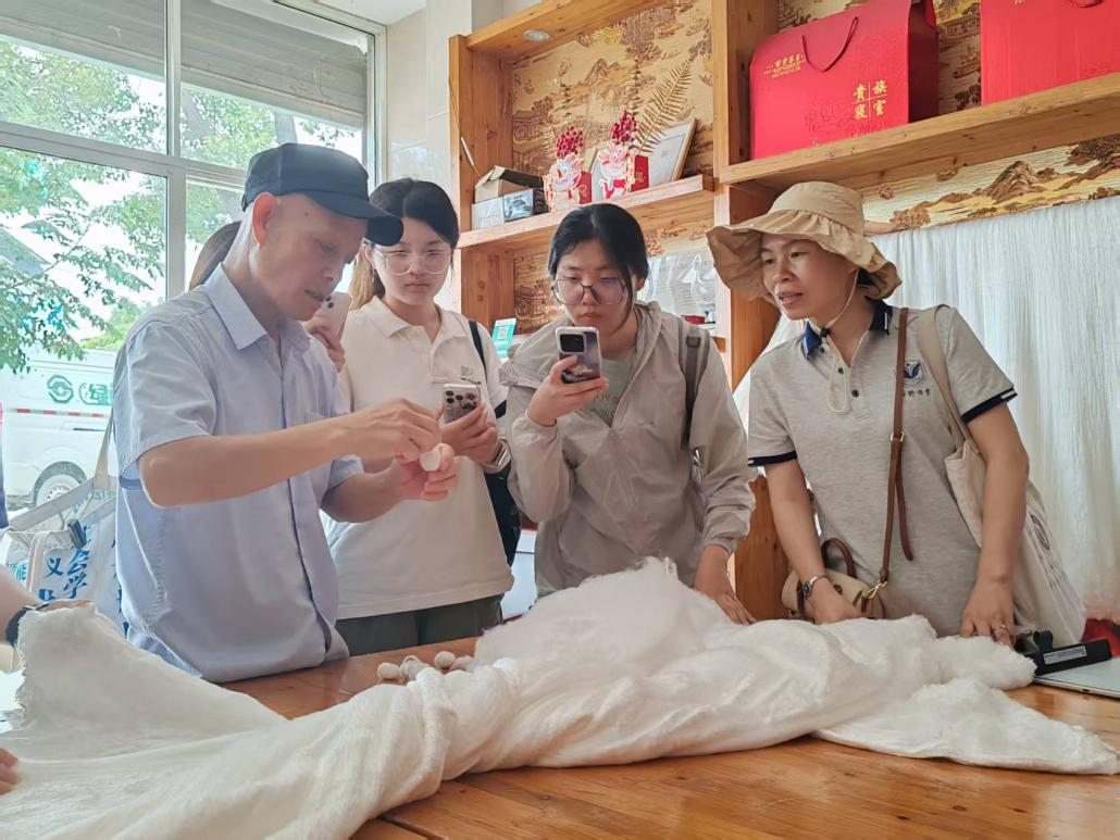 乡村振兴的关键在于产业振兴。党的十九大提出实施乡村振兴战略以来,开弦弓村依托省级特色田园乡村建设,努力打造“中国·江村”示范区。调研团队走访发现,在各级政府的支持下,村里引入社会资本,着力打造稻园、蟹园、桑园三大农业品牌,推动高密度养殖整改,关停高污染纺织企业,促进传统丝织业向绿色高效转型。同时,以“江村”文化IP打造文旅研学新业态。部分村民也尝试电商带货增收。在参观村办企业和与村民交流后,杨可老师现场引导讨论:“大家看到了养蚕缫丝的产业变迁,可以随着费老探索的乡村工业化路径,进一步思考三代女工们的生命历程。”团队成员笪译丹感慨:“唯有沉入生活肌理,方能理解中国乡村结构的韧性与变迁的动力。费老揭示的路径,至今仍是解锁乡土中国发展之问的重要钥匙。”
